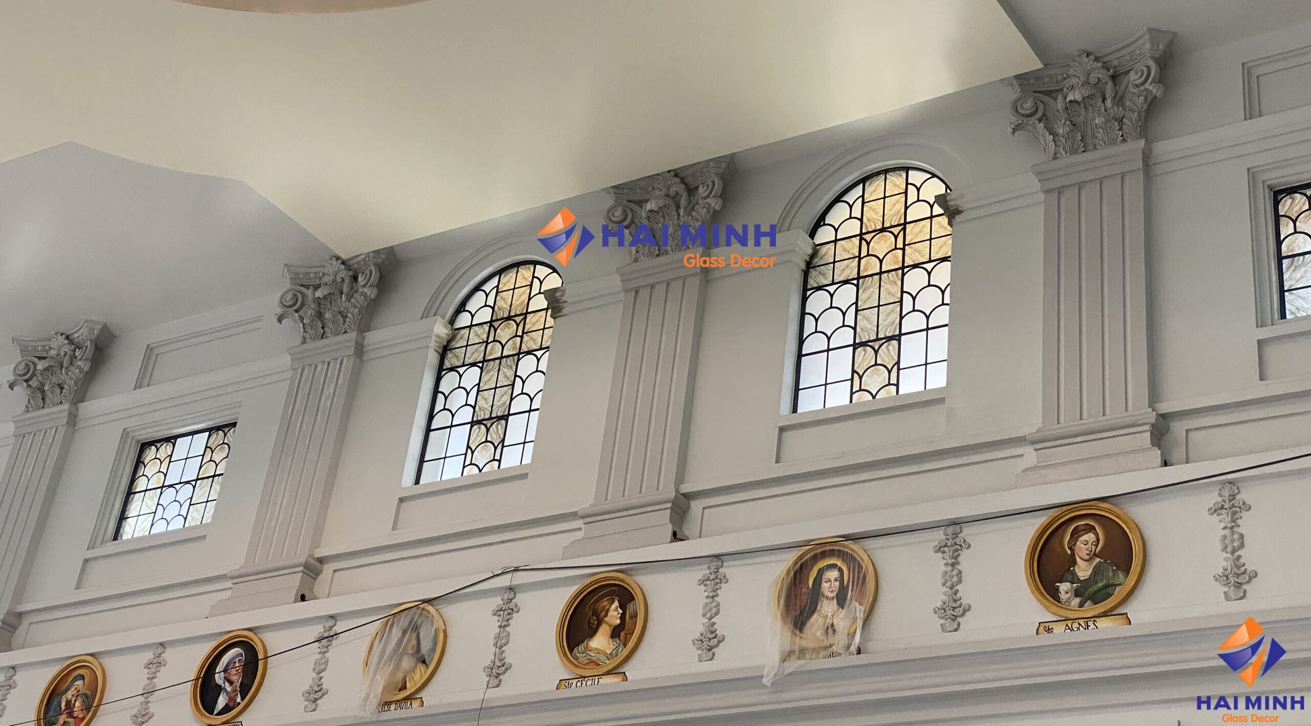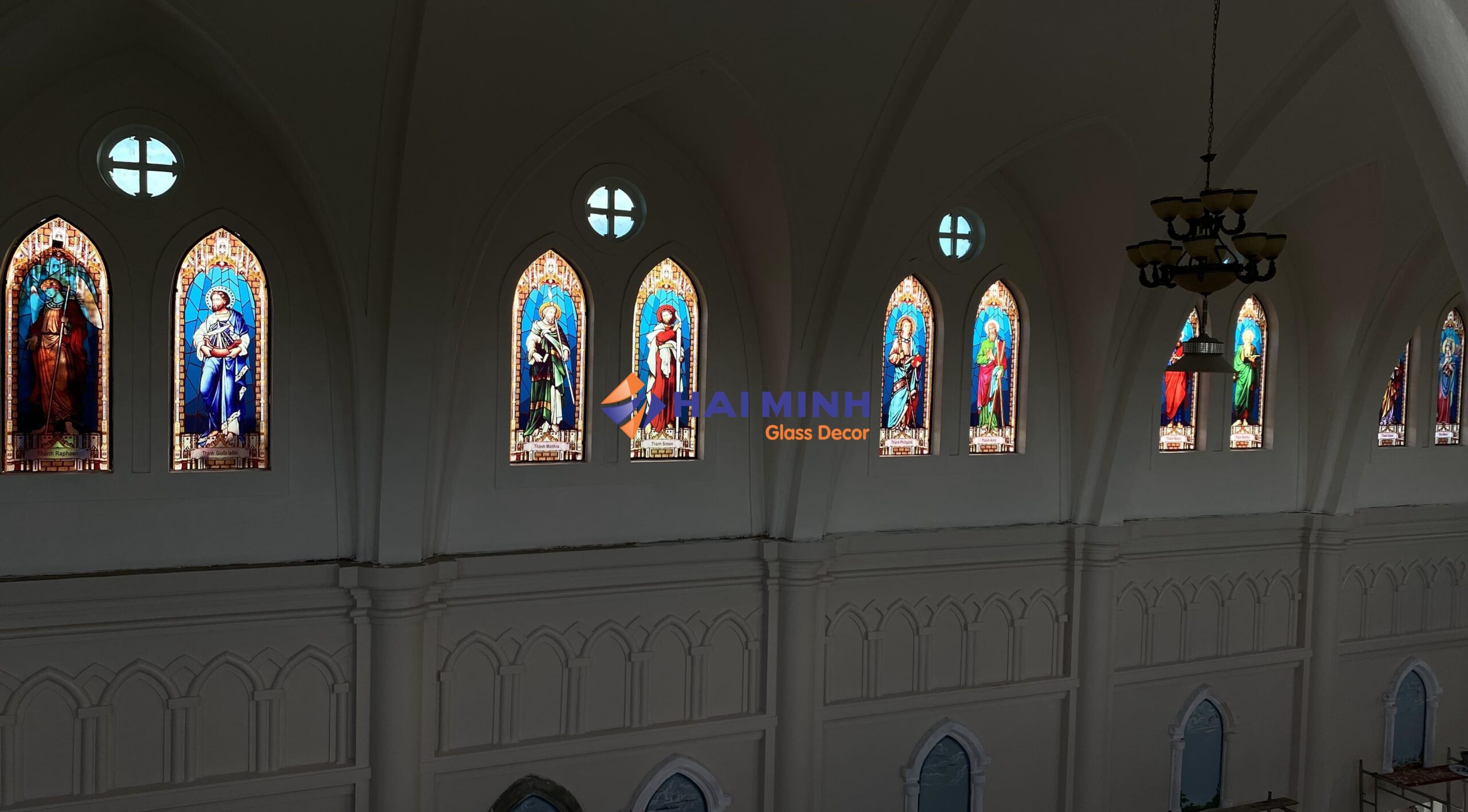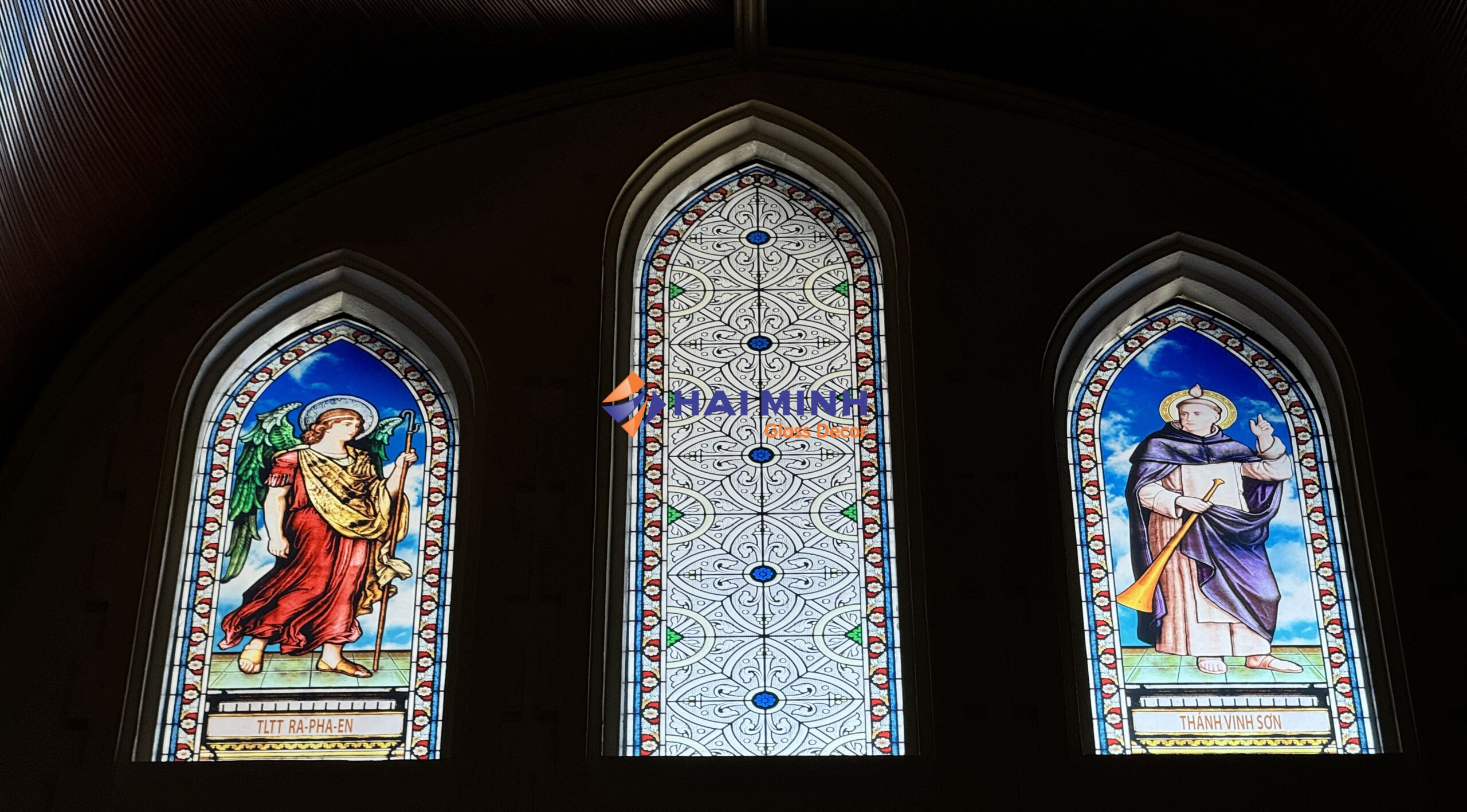 Tranh kính nhà thờ bằng trần hoa hồng kết hợp các vị Thánh