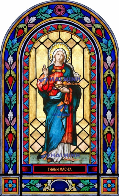 • Hình ảnh Thánh Mácta trong trang phục truyền thống, tay cầm chén lễ – biểu tượng của sự phục vụ và đức tin khiêm nhường.